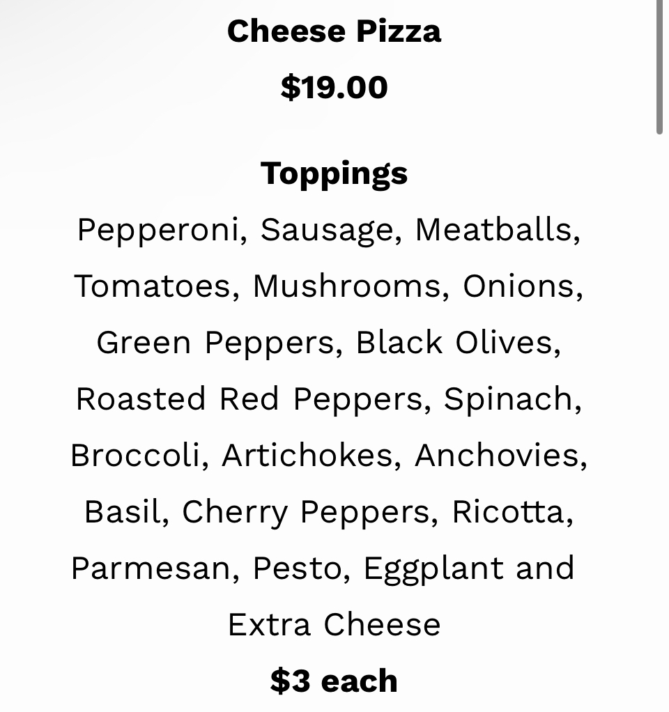 Popular Dishes: Dive into their signature 18" Whole Pies where you can savor mouthwatering combinations like the Bronx Deluxe, loaded with pepperoni, sausage, mushrooms, and a medley of vegetables for just US$31.00. If you're in a lighter vein, the Veggie pie offers a fresh burst of flavors with mushrooms, black olives, onions, and tomatoes—all for just US$22.00. For those moments when you want something to hold in your hands while you go about your day, their Calzone featuring mozzarella, ricotta, and parmesan is a must-try at only US$11.00, and it’s filled with cheesy goodness that will keep you coming back for more. Don't forget to add those extra toppings for just a few bucks!